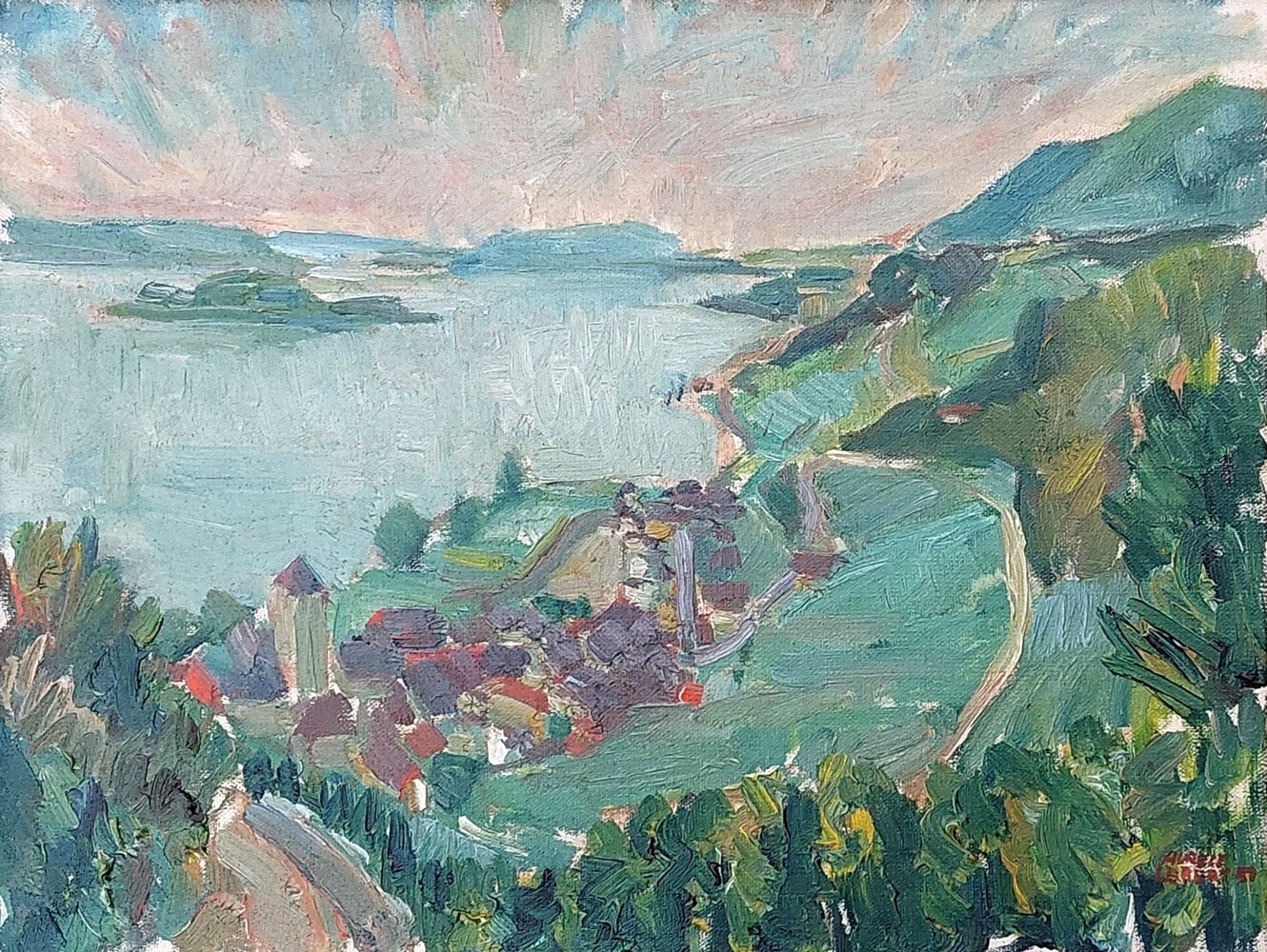 D'autres, comme le « Stàdtiberg », le « Werdthof », la « Montagne de Boujean », « le Lac de Bienne » va de Tschugg, ou « Epsach », sont peut-être moins ambitieux. Mais toujours le peintre fait chanter de manière très heureuse et très habile les verts et les noirs avec les bleus et les roses. Il traduit sans les alourdir, en les allégeant même, les caractéristiques du paysage, la terre, les forêts, les arbres disséminés, pour que jamais ils ne pèsent, mais qu'ils servent de base, d'autel et d'offertoire à ces merveilleux ciels, tantôt très animés, très mouvementés, tantôt calmes et comme endormis dans leur lumière diaphane, qui donnent en général leur sens véritable à ces compositions. '