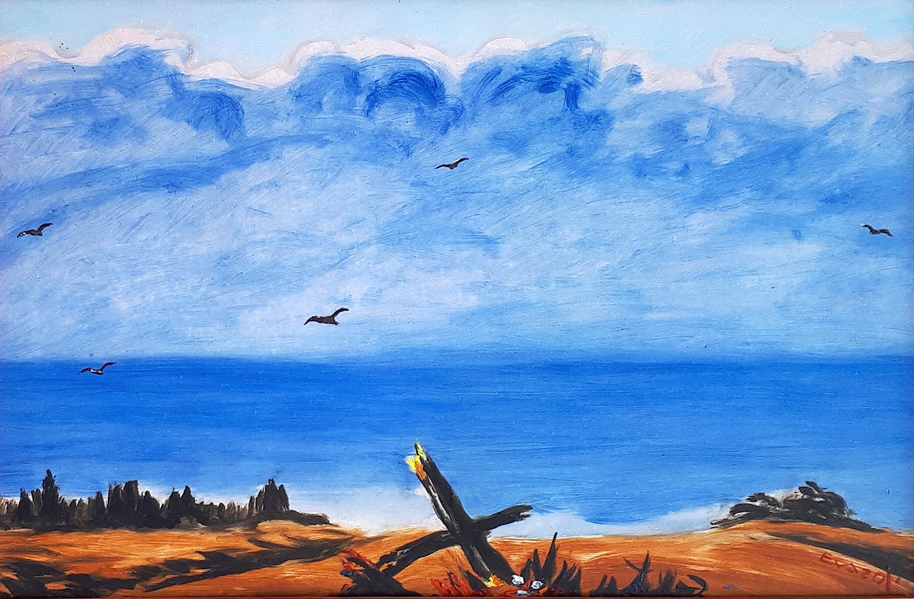 Cela n'empêche pas ce passionné de planter jusqu'aux ultimes moments de sa vie, achevée en 1972, ses paysages aux pâtes lourdes incandescentes de ciel. Au centre d'un soleil qui défie et se confie au-delà du bon goût, n'ose-t-il pas, cet insensé, poser sa signature en remous de ruisseau ?