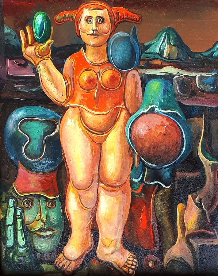 Dans son œuvre on peut distinguer deux périodes et deux styles très différents, ce sont des périodes très productives. Dans sa jeunesse il exécute des peintures surréalistes avec les couleurs de basse fréquence où dominent des verts, des marrons, où éclatent souvent très fort des rouges. Au bout d’une période de recherche des différentes techniques et façons d’expression vers les années 1980 il arrive par l’abstraction à l’art non-figuratif. Puis pendant la dernière période de son œuvre, il peint des tableaux expressifs, ce sont les images figuratives et non-figuratives.