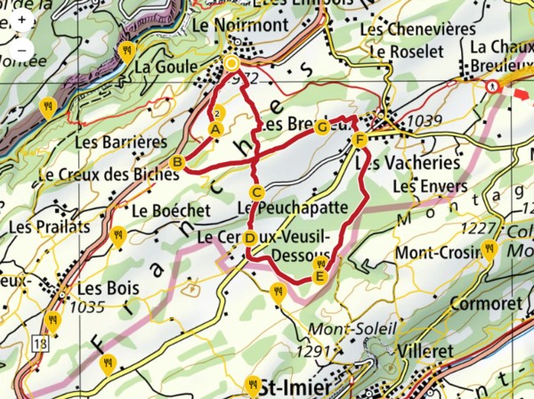 Au pt 1131, traverser la route Les Breuleux-Le Peu-Claude et descendre à travers le pâturage jusqu’au Cerneux-Veusil-Dessous (pt 1018).