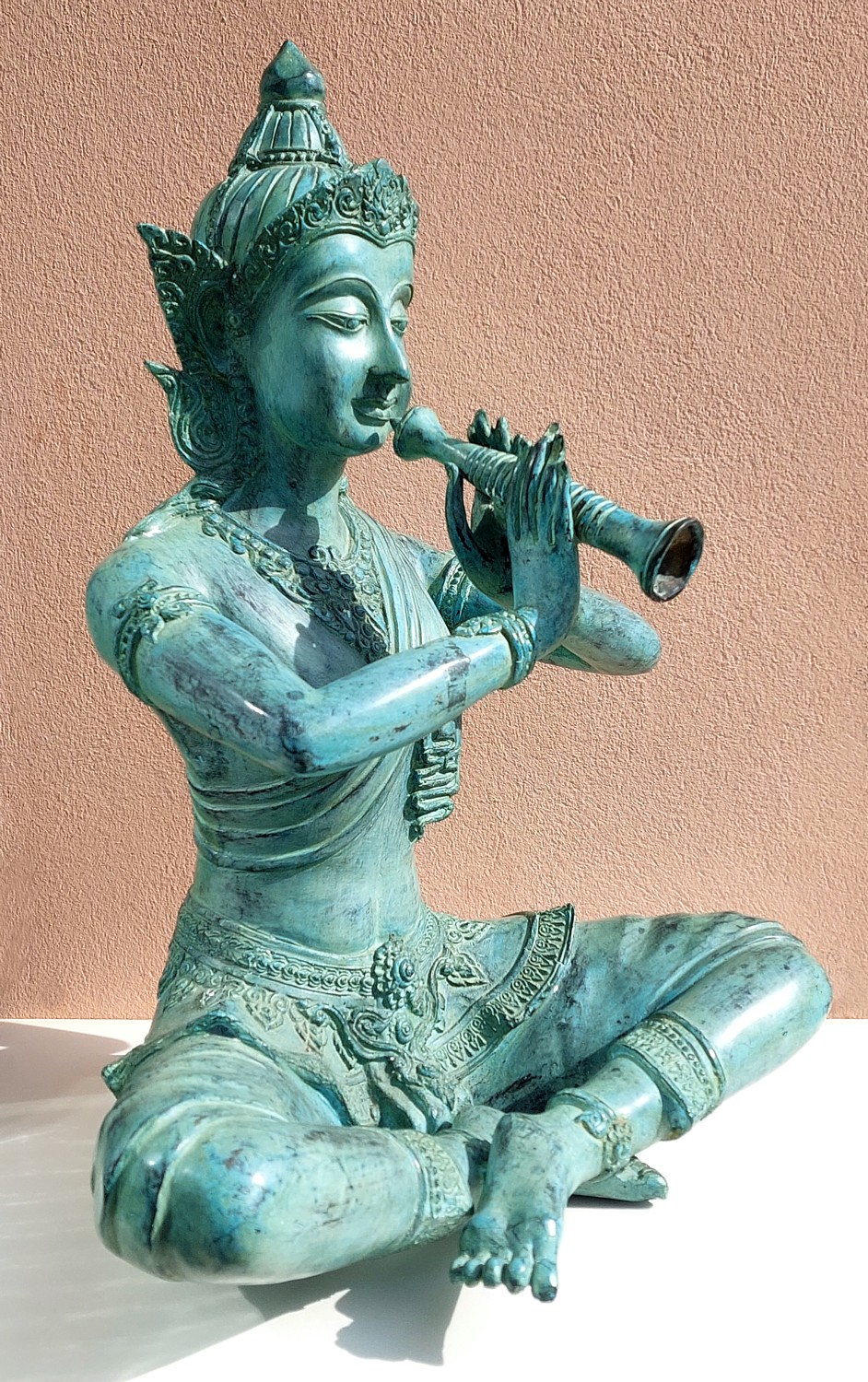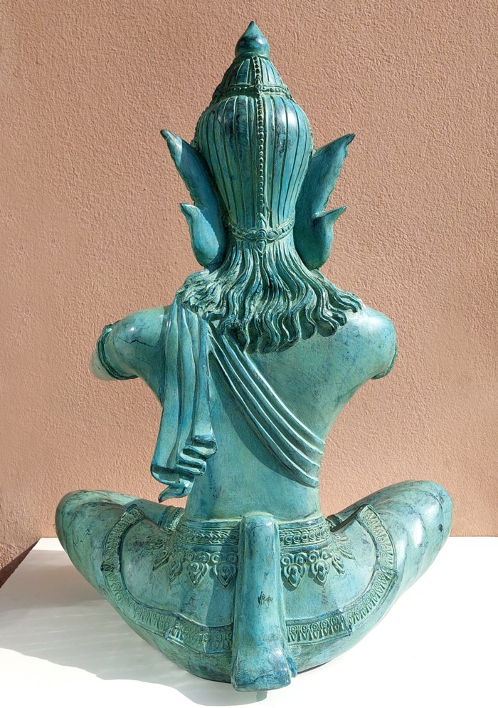 Ancienne grande statue thaï en bronze patiné vert, richement décorée