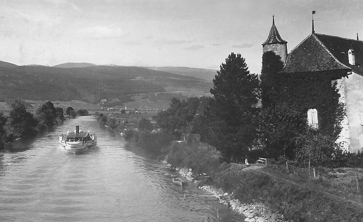 Le château a été construit pour protéger le pont du Zihl sur la rive gauche du Zihl, près de la ville de Thielle.