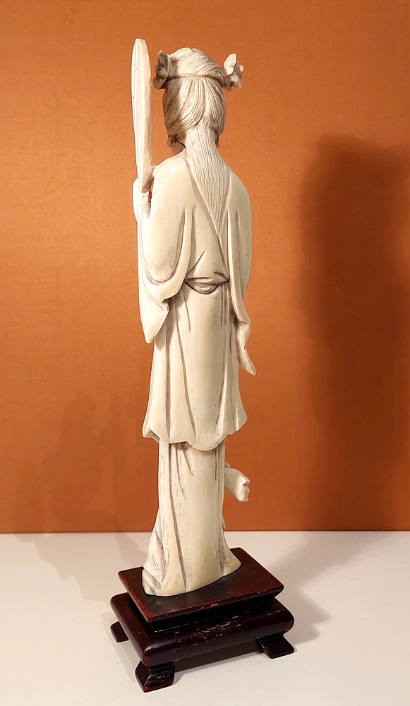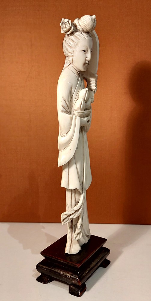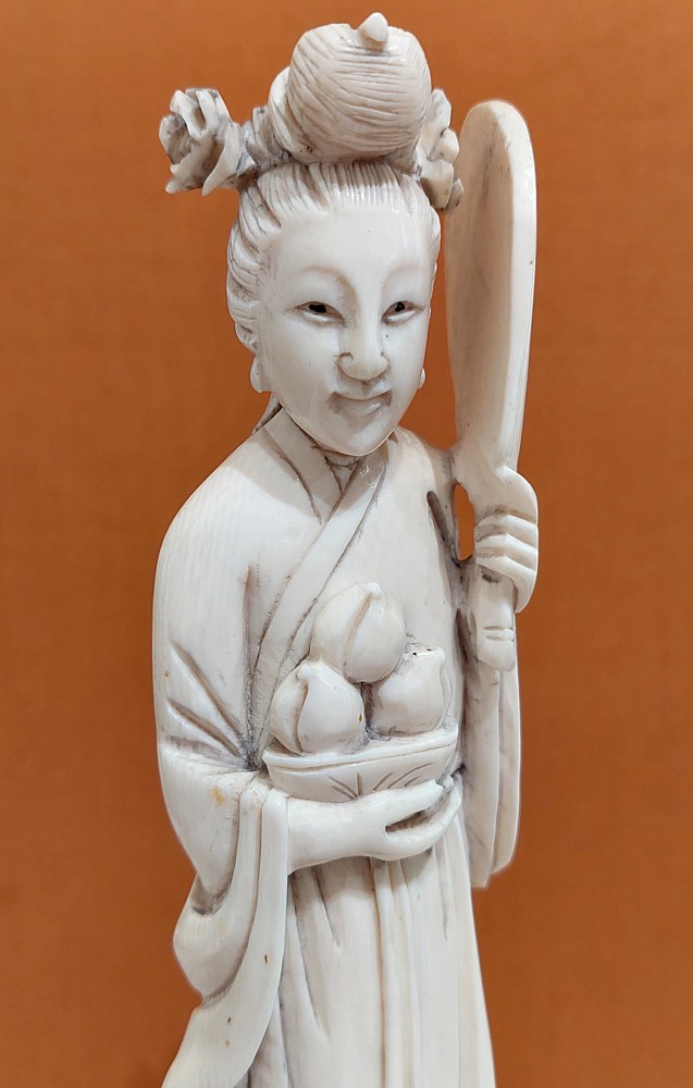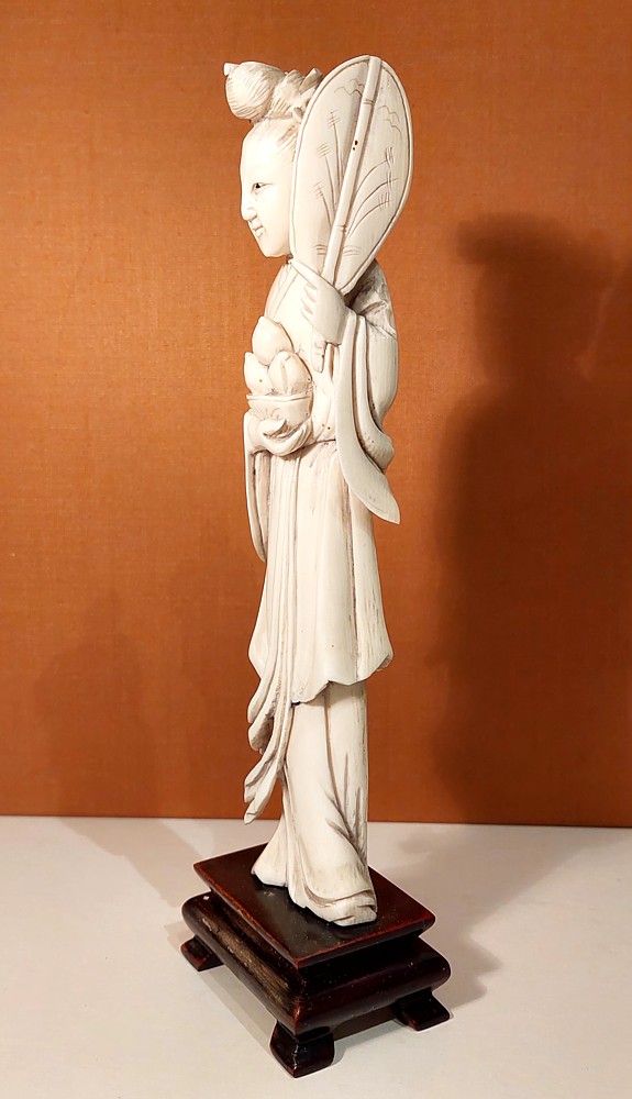 Statuette en ivoire représentant une femme de cour portant une coupe de fruits et un éventail, Chine milieu du XXème siècle