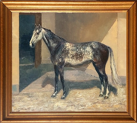 Oui, celle du chantre au long souffle de la race chevaline. Dont on ne se lasse pas ses aspects les plus variés et tellement idylliques. Sociétaire du Salon des Indépendants de Paris, lauréat du Prix "signatures", médaille d'Arts, Sciences et Lettres, Officier du Mérite culturel et artistique, Georges TRINCOT est né le 14 mars 1921. Trincot a exposé notamment à New-York, Bruxelles, Luxembourg, Monte-Carlo, Cannes (au Canton), à Paris (galerie des Champs-Élysées), en Allemagne et en Suisse.